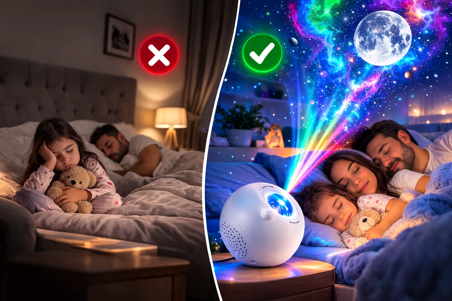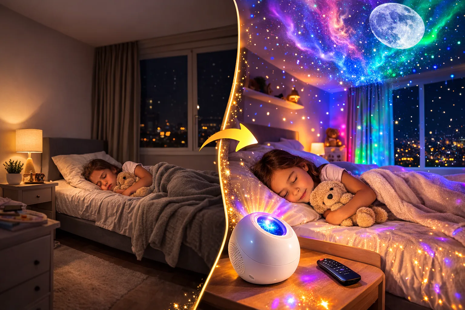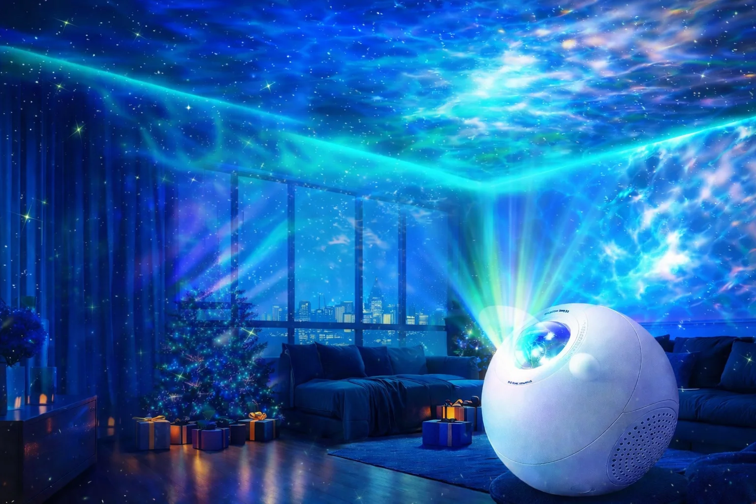 يقوم الجهاز بعرض نجوم لامعة وسدم كونية بألوان متعددة على السقف والجدران ليحول غرفتك إلى مشهد فضائي ساحر.